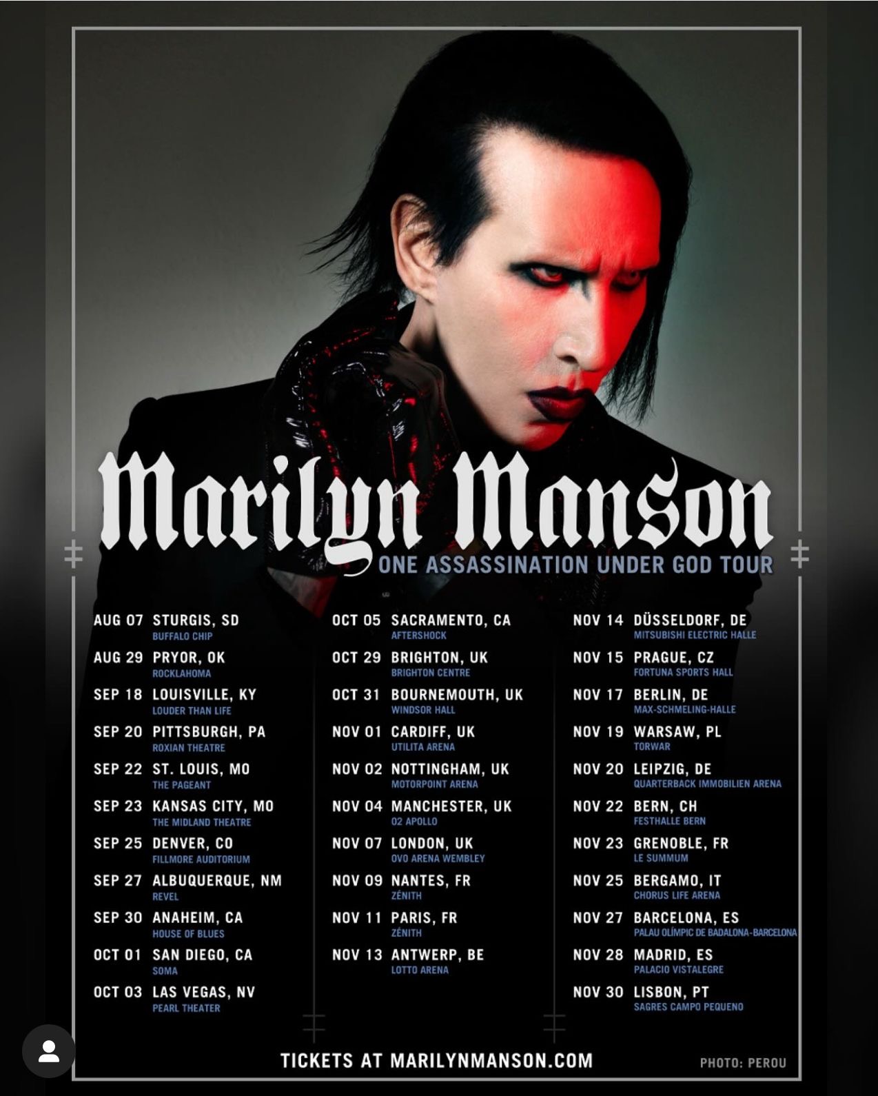 Facebook0Twitter0Pinterest0Google+0Marilyn Manson, el icónico artista del rock industrial, ha anunciado su regreso a España con dos conciertos programados para finales de noviembre. La gira “One Assassination Under God Tour” lo llevará a actuar el 27 de noviembre en el Palau Olímpic de Badalona y el 28 de noviembre en el Palacio Vistalegre de Madrid. Las entradas para ambos conciertos estarán disponibles a partir del viernes 4 de abril a las 10:00 horas a través de doctormusic.com y entradas.com. Los precios son los siguientes:• Grada: 62, 68 y 74 euros• Pista: 64 euros• Pista Front Stage: 90 eurosEstos precios no incluyen los gastos de distribución. Además, se ofrecerán paquetes VIP para aquellos que deseen una experiencia más exclusiva. Marilyn Manson presentará en directo su duodécimo álbum, “One Assassination Under God – Chapter 1”, lanzado a finales de 2024 y disponible en todas las plataformas digitales. El público podrá disfrutar de nuevos temas, así como de clásicos como “The Beautiful People” y “mOBSCENE”. El Palau Olímpic de Badalona, conocido por su excelente acústica y capacidad para albergar a miles de espectadores, será el escenario perfecto para este esperado concierto. Dada la expectación generada, se recomienda adquirir las entradas con antelación para no perderse esta oportunidad única de ver a Marilyn Manson en directo.Facebook0Twitter0Pinterest0Google+0