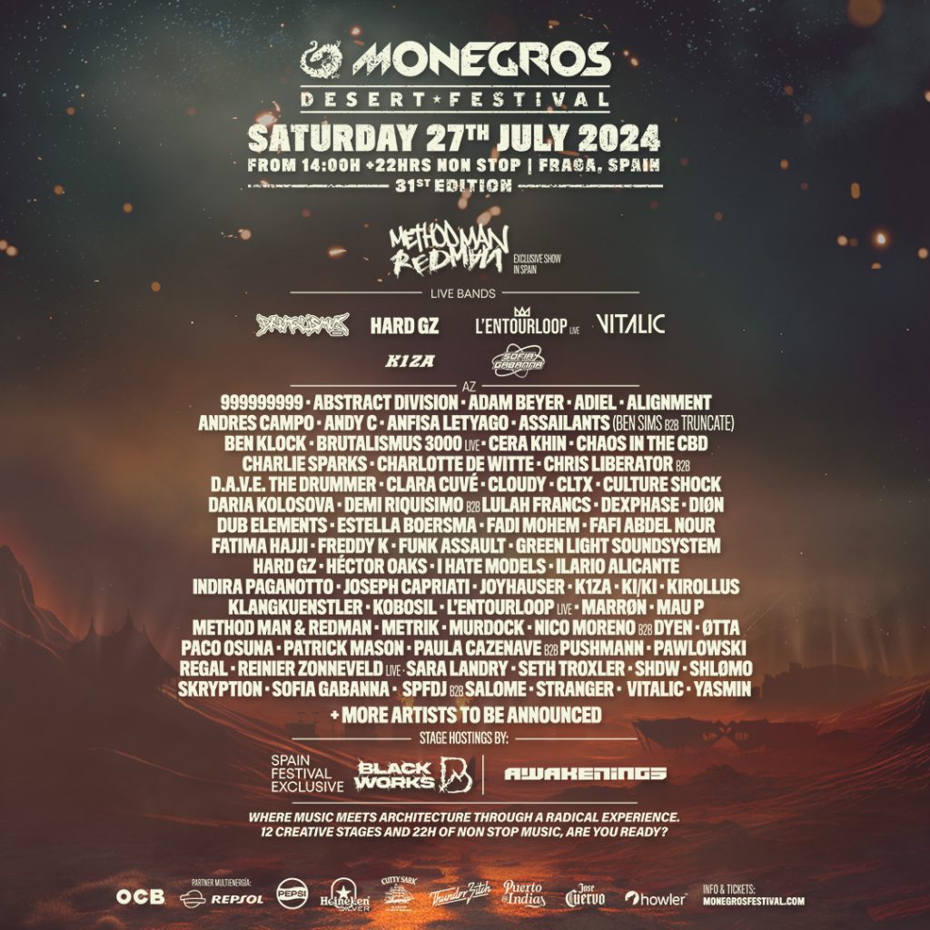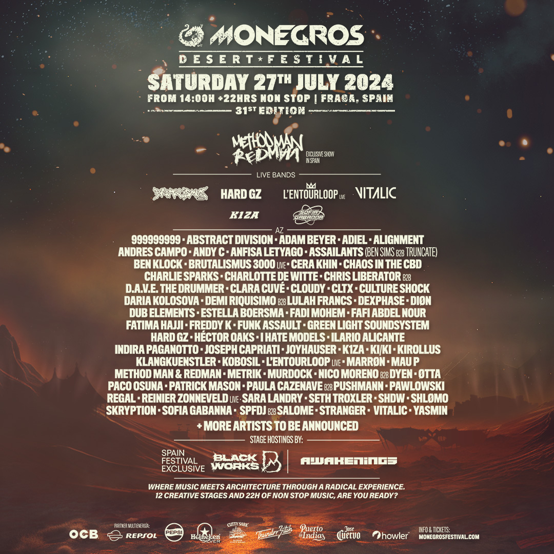 La celebración de su trigésima edición fue un hito en la historia de Monegros Desert Festival, conmemorando de manera espectacular tres décadas de vida. Atrajo a más de 50,000 almas procedentes de 90 países en una jornada única, donde más de 150 artistas se presentaron durante 22 horas ininterrumpidas en el corazón del desierto aragonés. Ahora, con la anticipada llegada de su 31 edición, el festival busca elevar la experiencia a un nuevo pico, manteniendo viva su esencia y la ideología original del movimiento R.A.V.E. Con un ambicioso line-up que amalgama tanto a artistas internacionales como nacionales, el festival continúa fusionando música, creatividad y performance con arquitecturas imposibles. Además, colaboraciones exclusivas y pioneras en España, como las de Blackworks o Awakenings, entre otras aún por anunciar, prometen llevar a Monegros Desert Festival a nuevas alturas, consolidando su posición como el evento de música electrónica más icónico, extremo y distintivo de Europa. MDF 2024 se compromete a brindar una experiencia audiovisual contundente e inolvidable con un line-up encabezado por maestros que son verdaderas leyendas de la música electrónica y el hip-hop. Entre los destacados artistas que liderarán esta experiencia R.A.V.E, el dúo estadounidense formado por Methodman y Redman, dos íconos dentro de la cultura del rap de la costa este, realizarán un exclusivo show en España, desatando su energía única y carismática para encender la arena del desierto aragonés. El frenético sonido de Brutalismus 3000 y la impactante actuación de Hard GZelevarán, más si cabe, la intensidad de esta jornada. La vibrante esencia de la agrupación al completo L’Entourloop, que apuesta por una actuación en formato Live, llevando al público a un viaje sonoro hipnotizante. La majestuosidad de Vitalicresonará con su presencia, entregando una actuación que fusiona la electrónica y el techno de manera magistral. Además, se hace realidad el tan esperado debut de Charlotte de Witte o la actuación de Fatima Hajji. Ambas agregarán su toque distintivo a la mezcla, prometiendo una experiencia musical que trascenderá los límites de la imaginación en Monegros Desert Festival 2024. Pero la festividad musical no se detiene ahí; el segundo plato de este extravagante banquete sonoro está a punto de deslumbrarnos con una ecléctica selección de artistas. Desde los maestros del techno 999999999 hasta la excepcional visión de Abstract Division, este elenco de talentos promete llevar la experiencia musical a nuevas alturas. Adam Beyer, el titán de Drumcode, liderará la noche con su imponente presencia, seguido de la fuerza implacable de la italiana Adiel y el ascendente fenómeno Aligment. Los habituales en el desierto Andrés Campo oPaco Osuna vuelven para aportar su genialidad musical. Mientras qué el mito de drum&bass, Andy C o el dúo Assailants, compuesto por Ben Sims y Truncate, desatarán una tormenta de sonidos tan potentes como inolvidables. Ben Klock, las musas Cera Khin, Indira Paganotto o Sara Landry, la frescura de los sets de Seth Troxler o la tándem Chaos in the CBD son solo algunos de los ingredientes que sazonarán este menú sonoro. Desde la mezcla caótica de Chris Liberator b2b D.A.V.E The Drummer hasta la exquisita propuesta de Clara Cuvé, este segundo plato promete una degustación de ritmos y melodías inigualables. Prepara tus sentidos para la experiencia sensorial más radical que hayas experimentado desde hace mucho tiempo. Esta revelación sigue con nombres como los de Cloudy, CLTX, Culture Shock, Daria Kolosova, Demi Riquisimo b2b Lulah Francs, Dexphase, Diøn, Dub Elements, Estella Boersma, Fadi Mohem, Fafi Abdel Nour, Freddy K, Funk Assault, Green Light Soundsystem, Hard GZ, Hector Oaks, I hate Models, Ilario Alicante, Joseph Capriati, Joyhauser, K1ZA, KI/KI, Kirollus, Klangkuenstler, Kobosil b2b Somewhen, Marrøm, Mau P, Metrik, Murdock, Nico Moreno b2b Dyen, øtta, Patrick Mason, Paula Cazenave b2b Pushmann, Pawlowski, Regal, Rennier Zonneveld (formato Live), SHDW, SHLømo, Sofía Gabanna, Skryption, SFDJ b2b Salome, Stranger, Yasmin, y muchos más. ¡La celebración musical sigue creciendo con un elenco incomparable de talentos aún por anunciar! Así que muy pendientes de sus redes sociales y de su web https://monegrosfestival.com/es para EstiloBCN Oscar Lari y Paco Marin